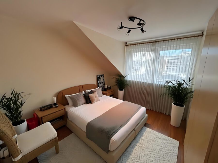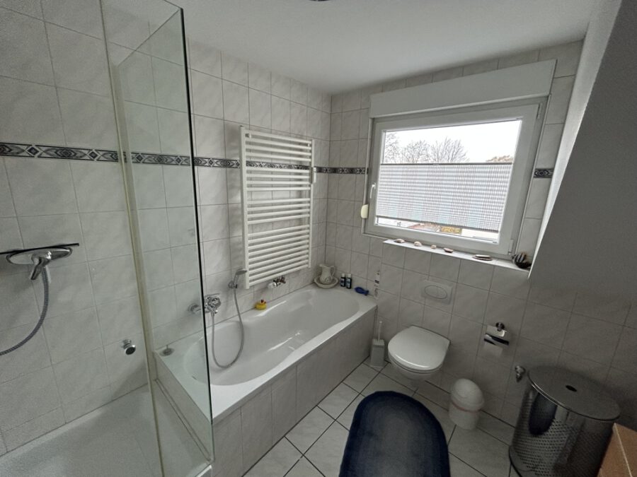 Vom geräumigen Wohn-/Essbereich samt kleiner Küche hat man Zugang zum Balkon und erreicht die beiden Schlafzimmer, das Badezimmer mit Dusche und Badewanne sowie das Gäste-WC.